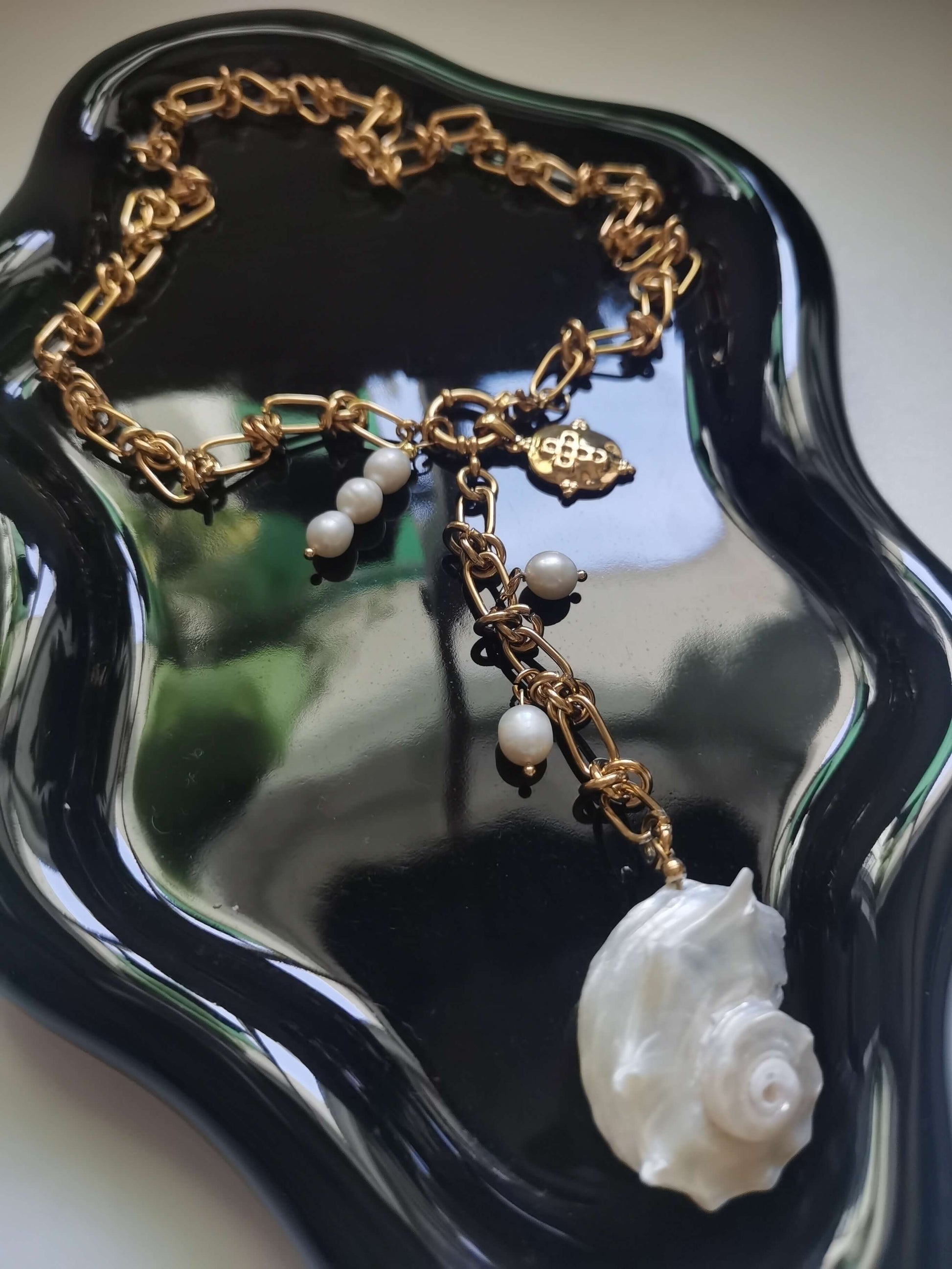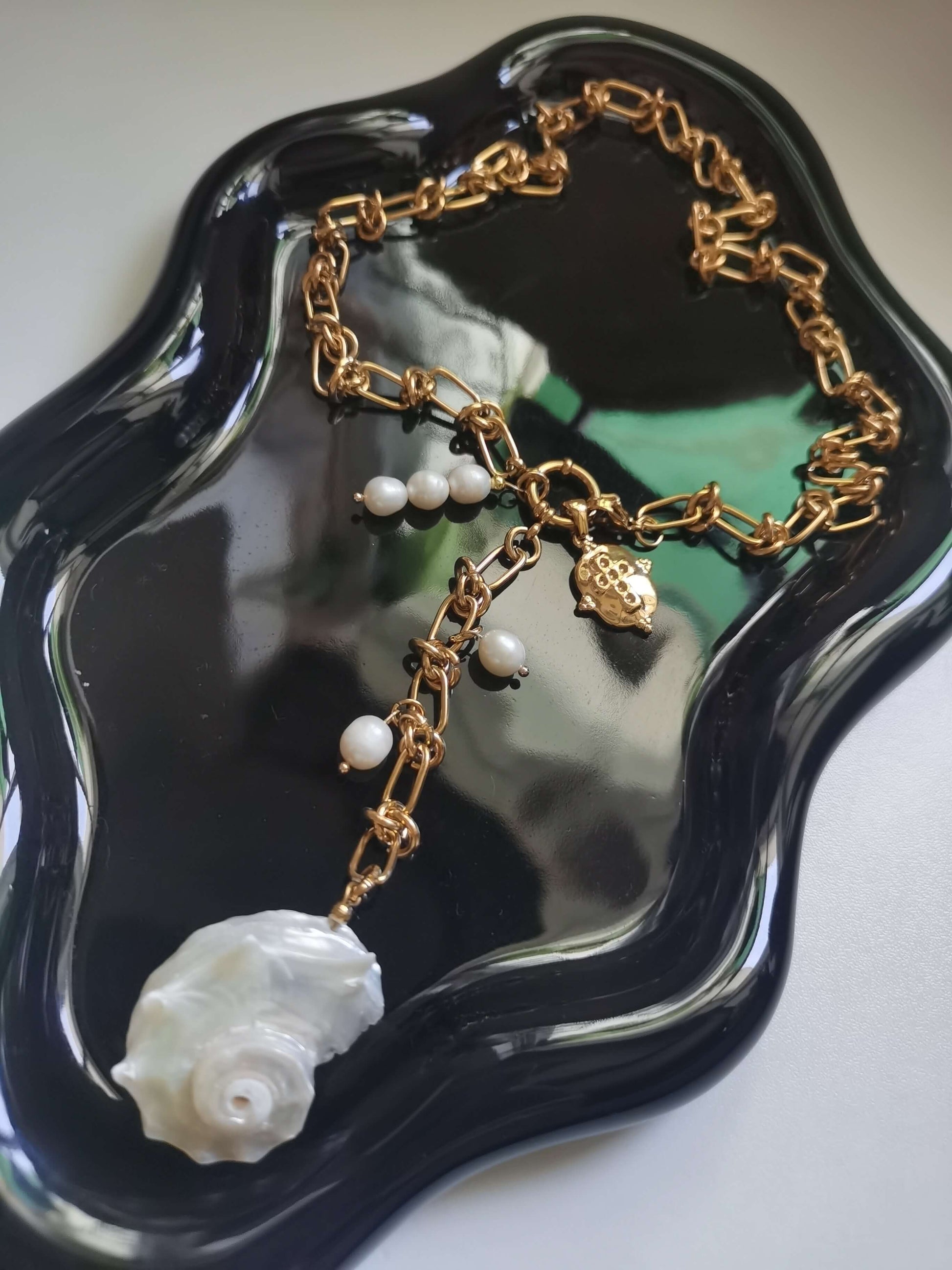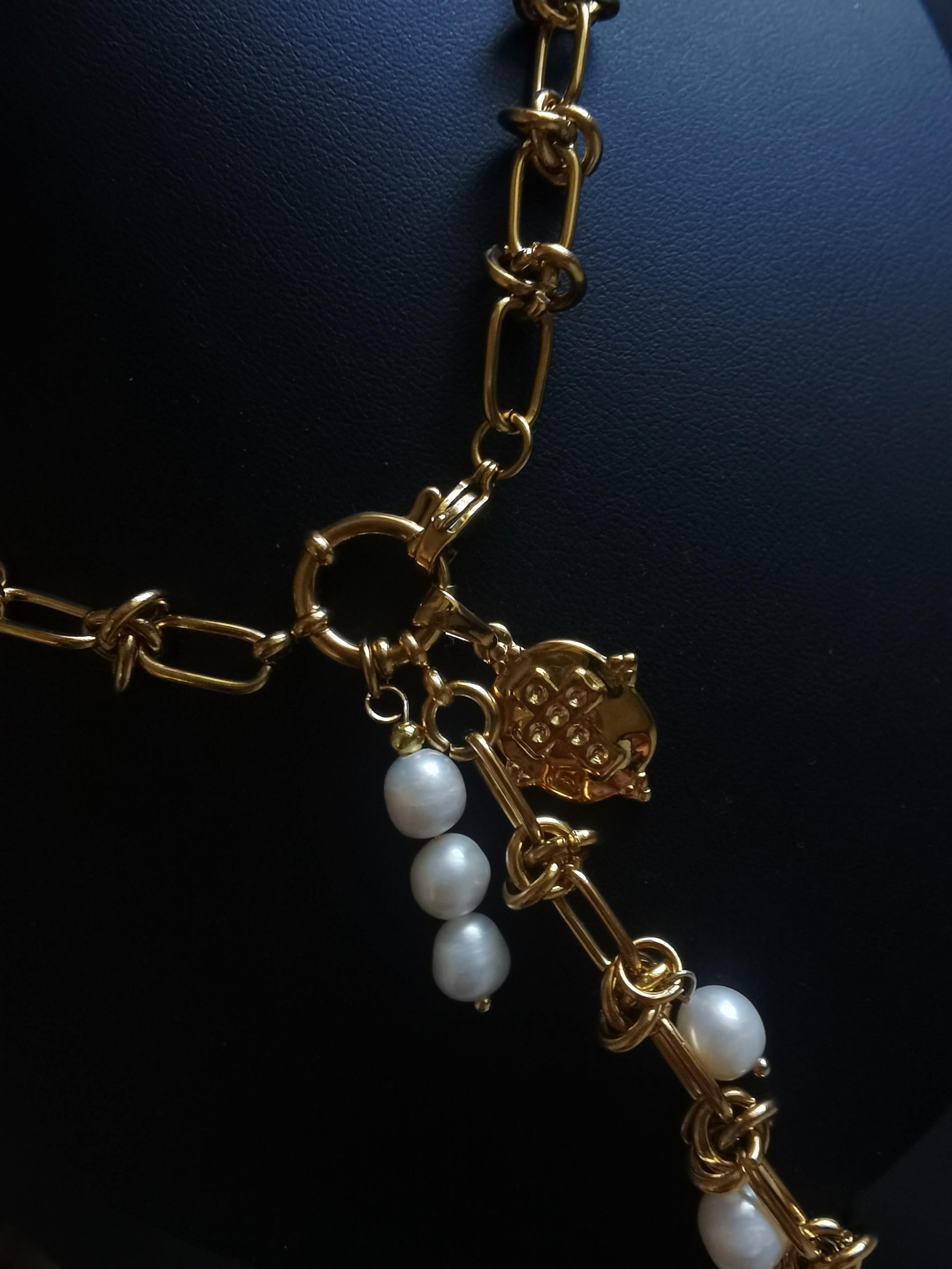 Material: Titanium Steel, 18k gold plated, freshwater pearls.