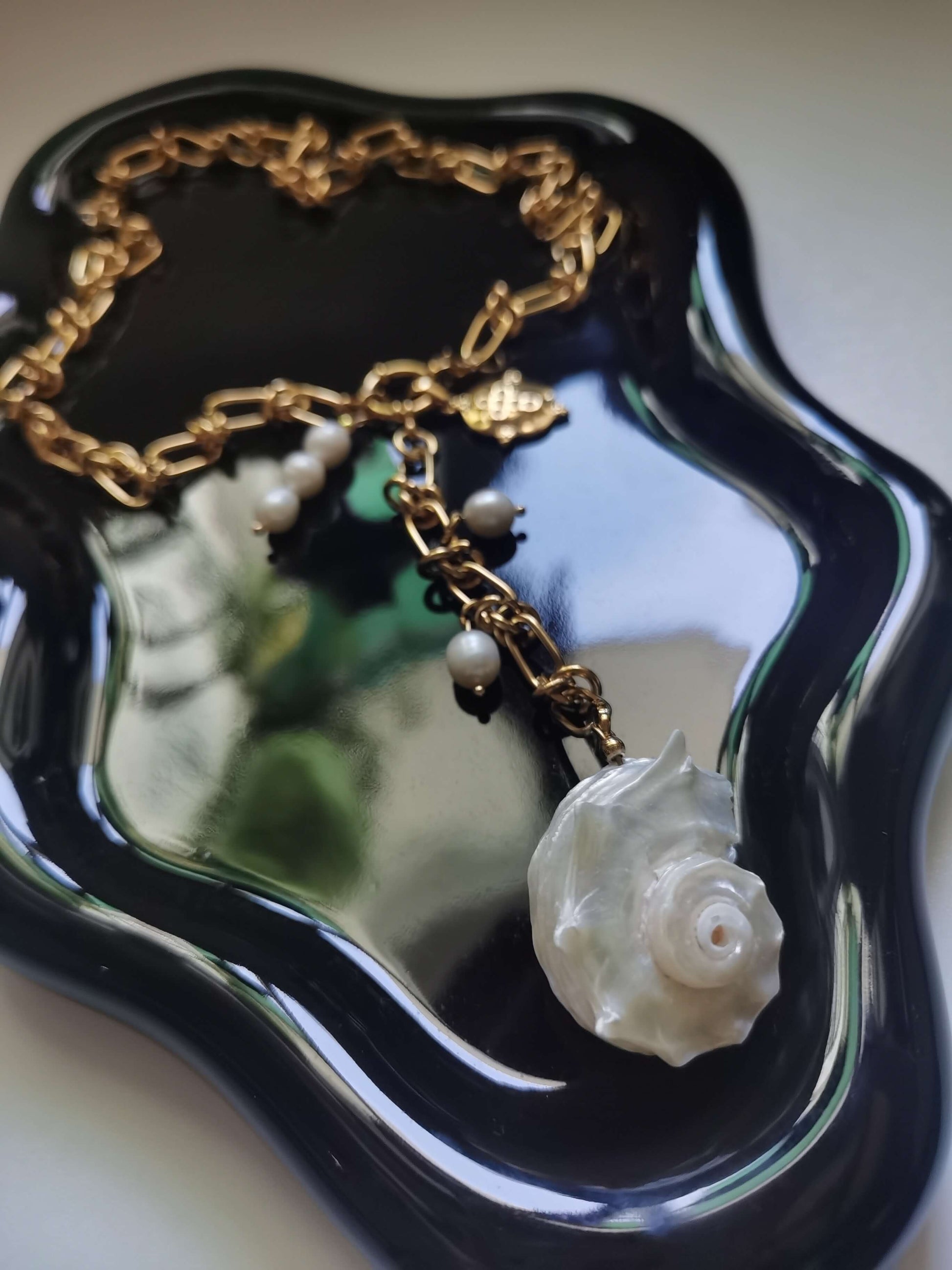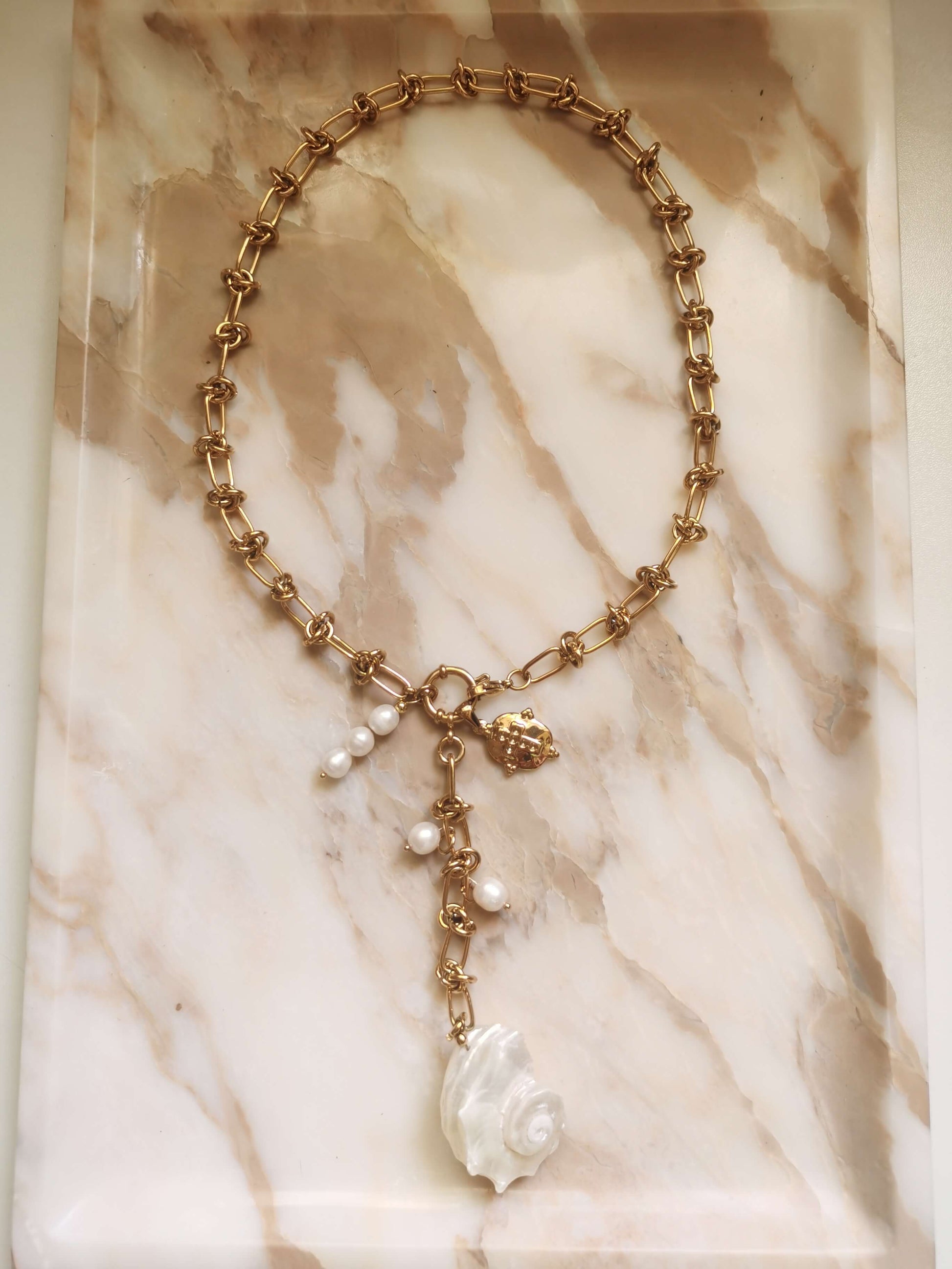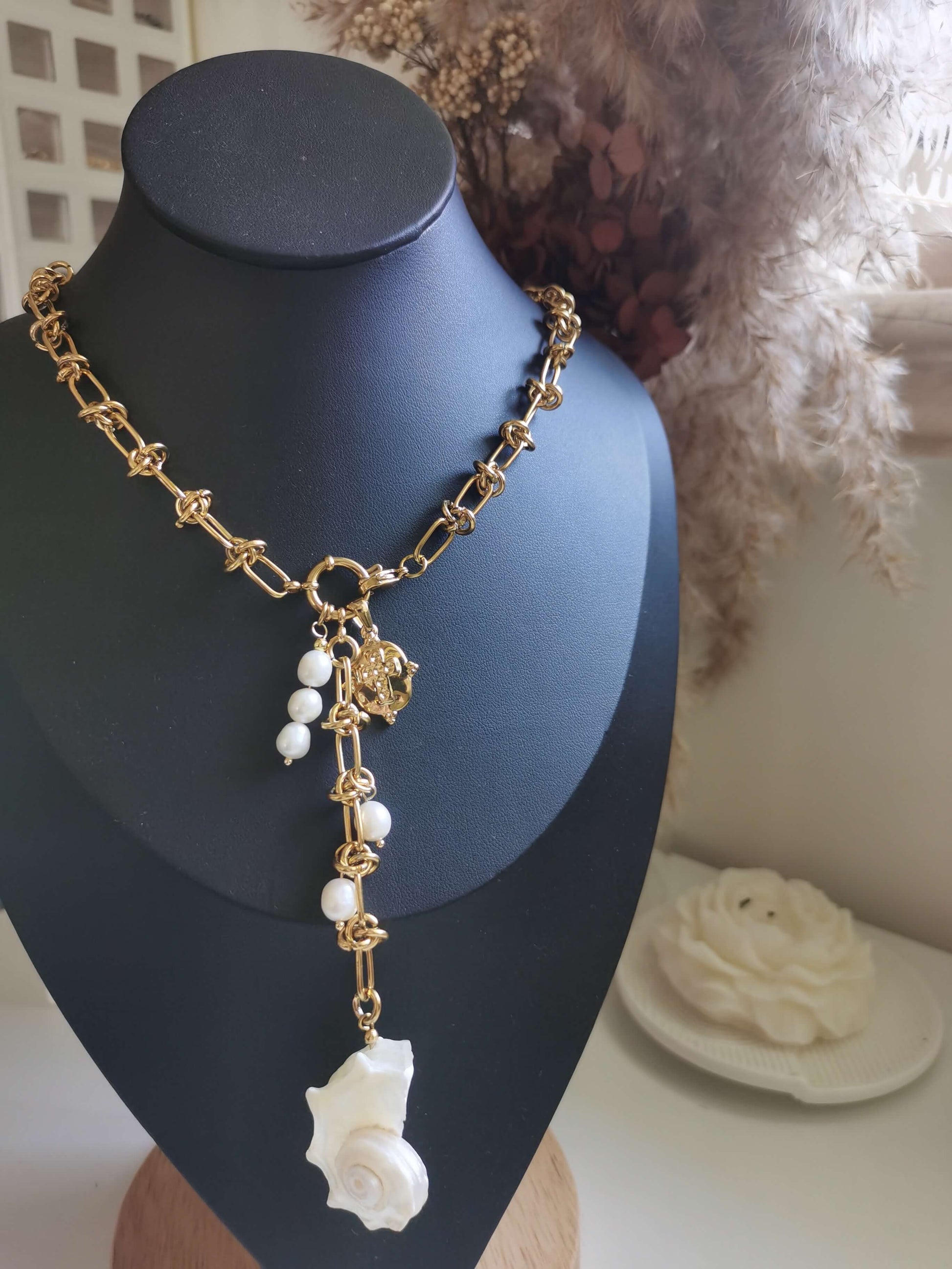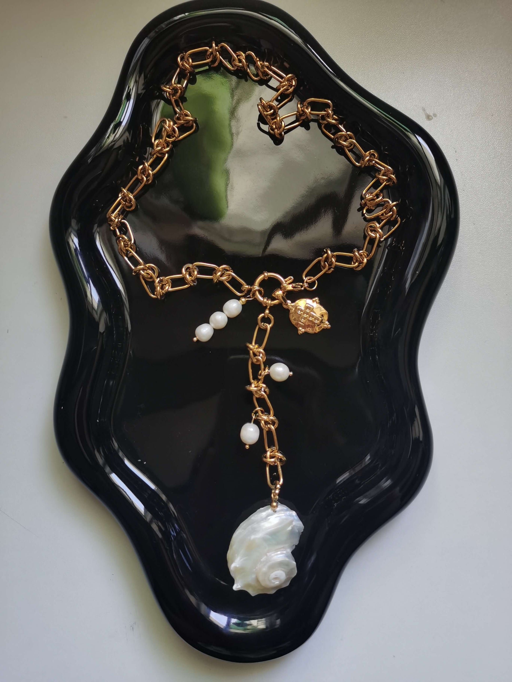 Material: Titanium Steel, 18k gold plated, freshwater pearls.