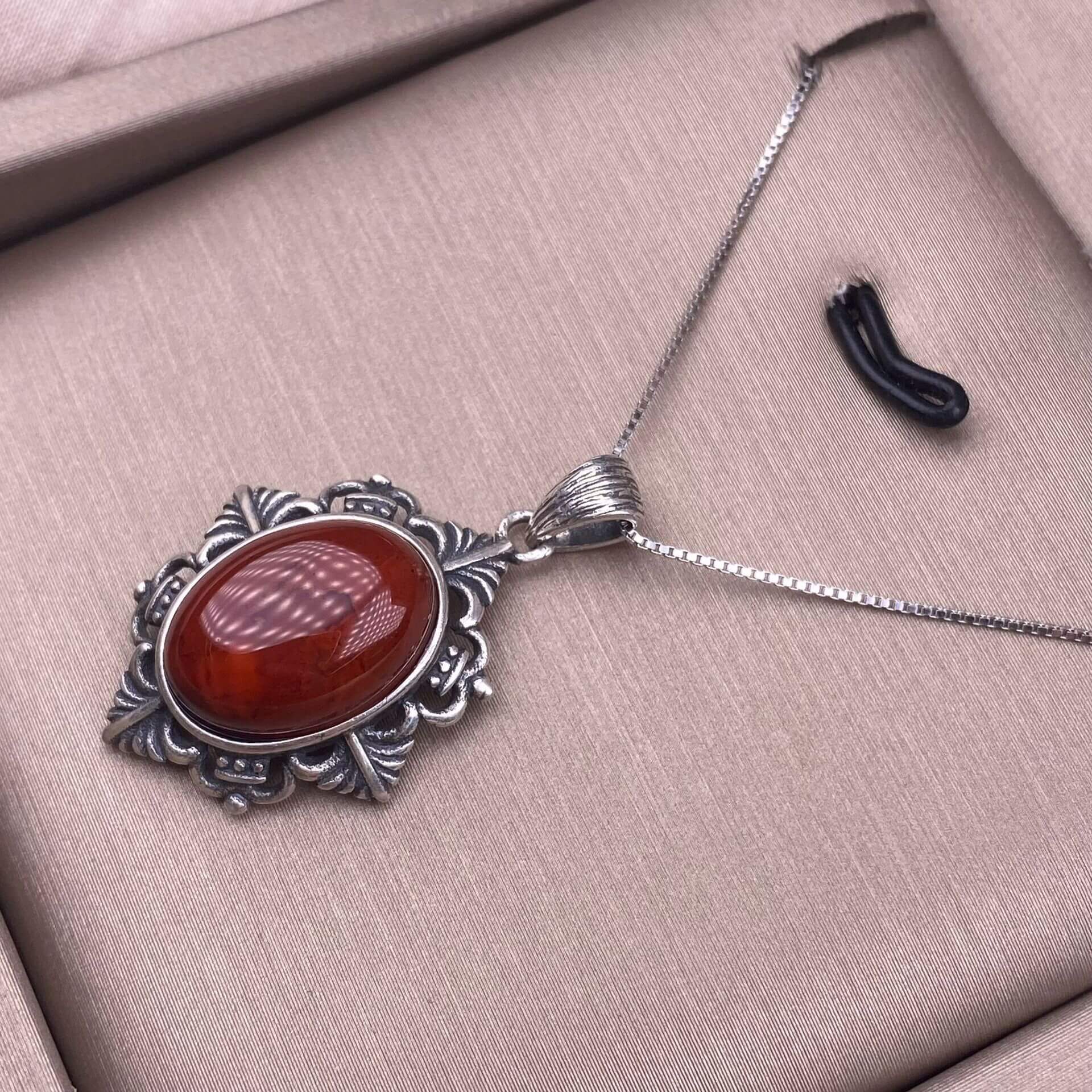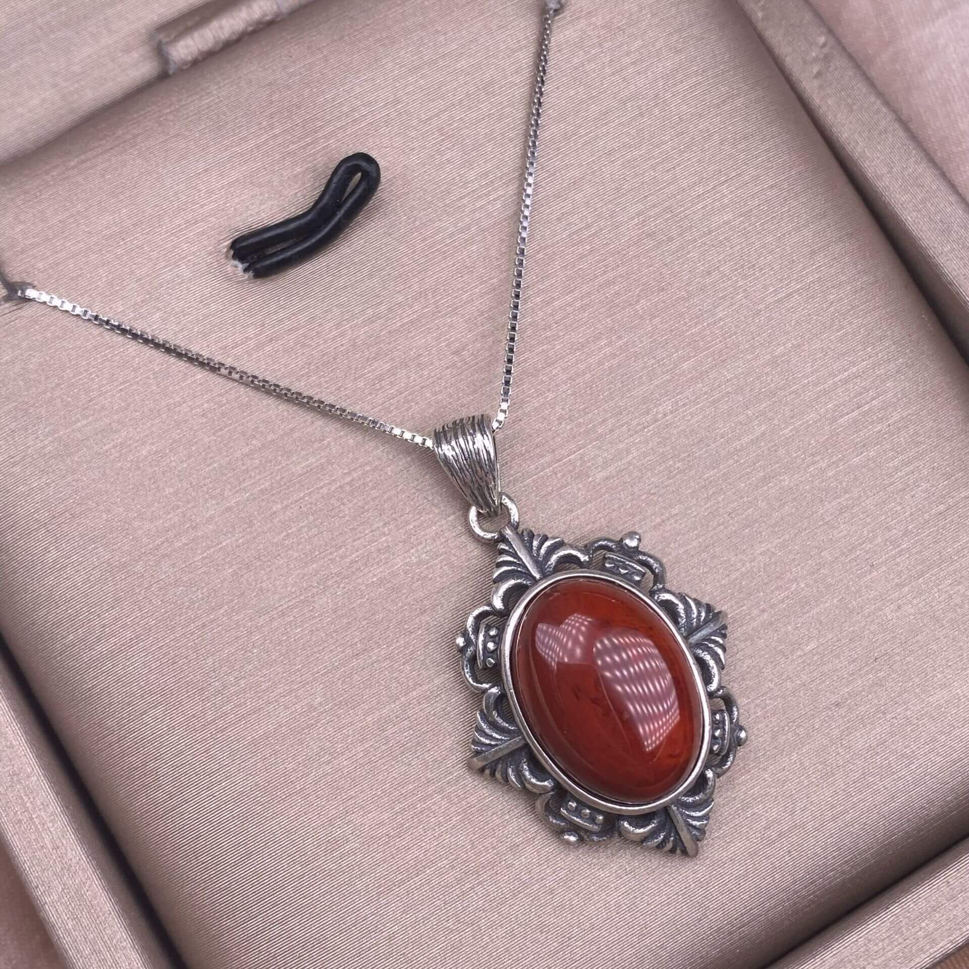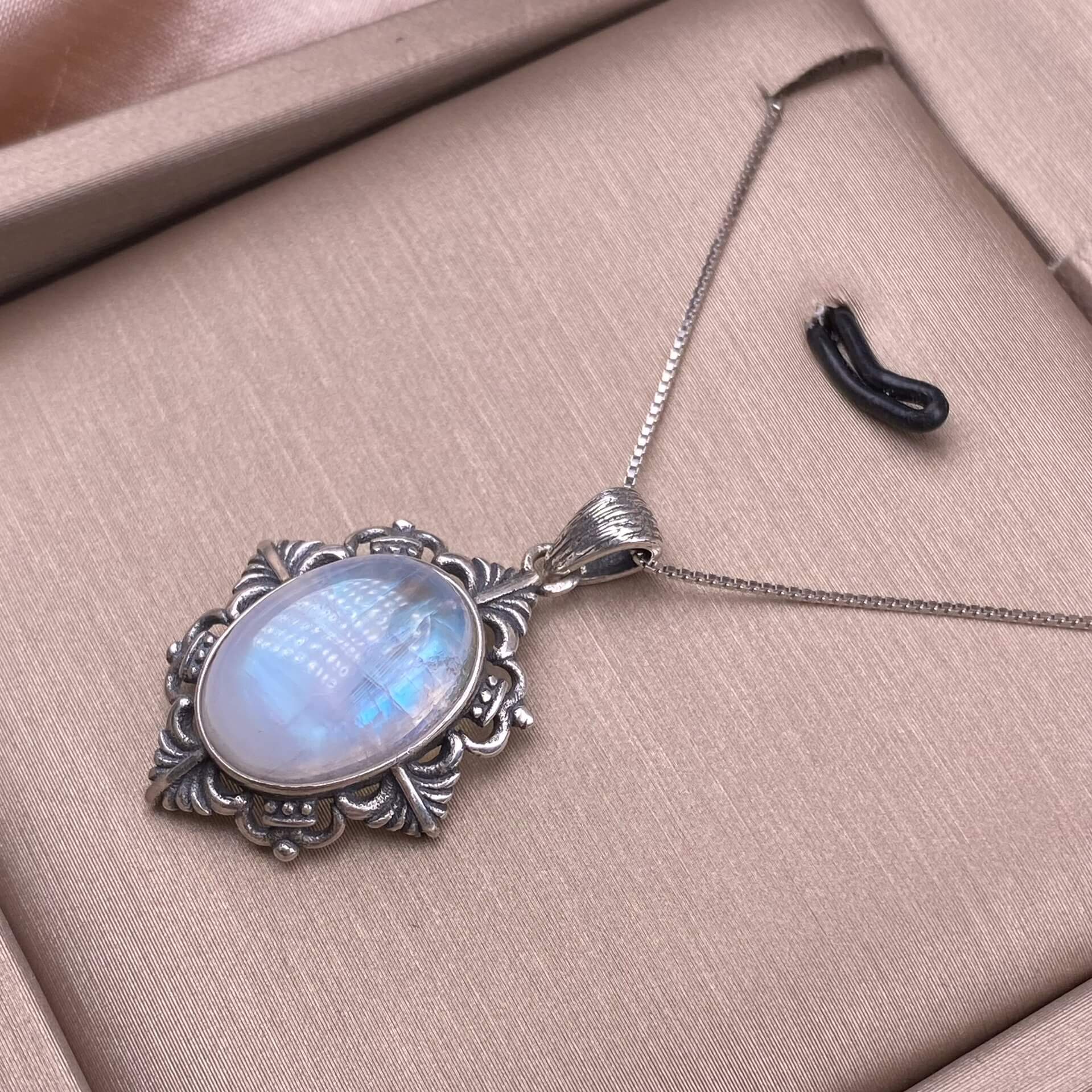 Blue Moonstone south red pendant S925 silver inlaid retro silver blue light Strong imitation ancient silver pendant Fashionable daily colored gemstone chain pendant GMSPe3