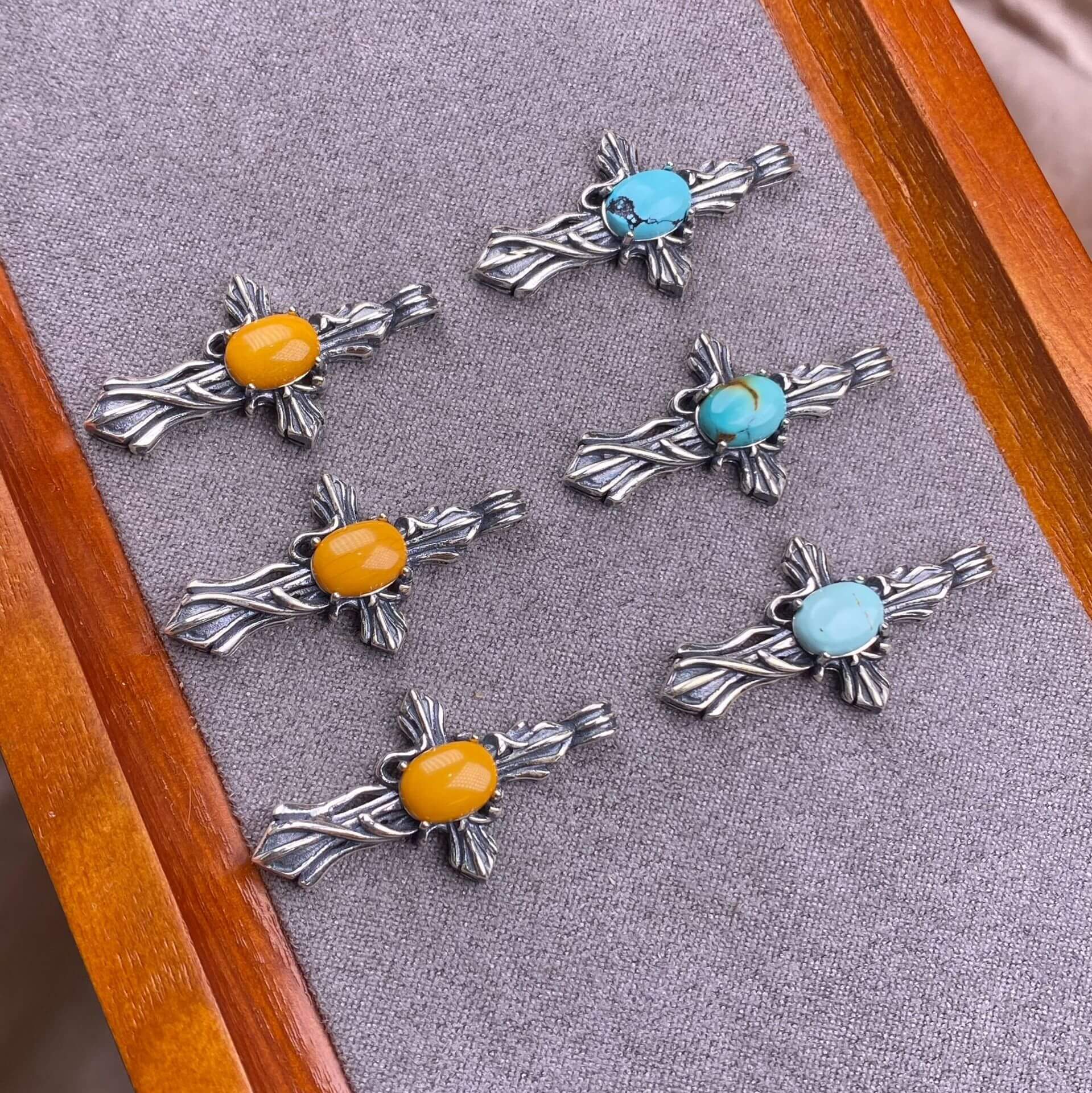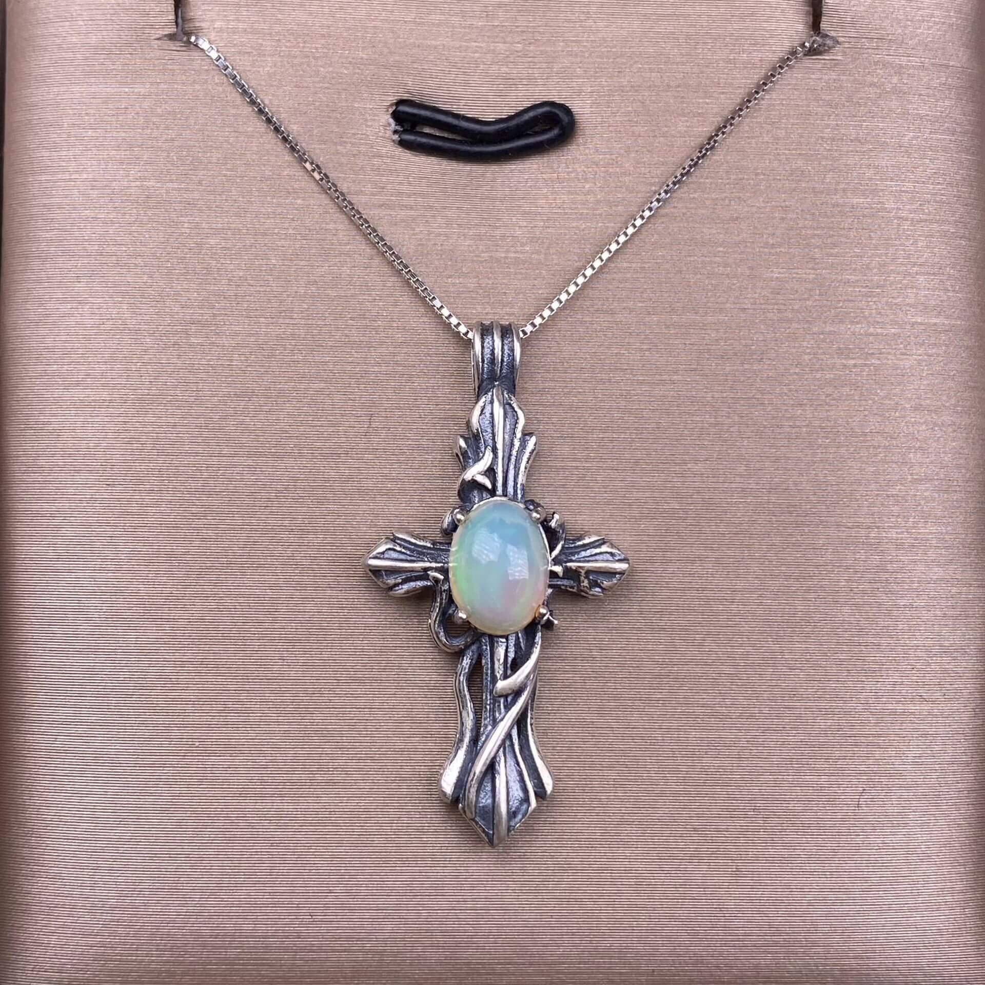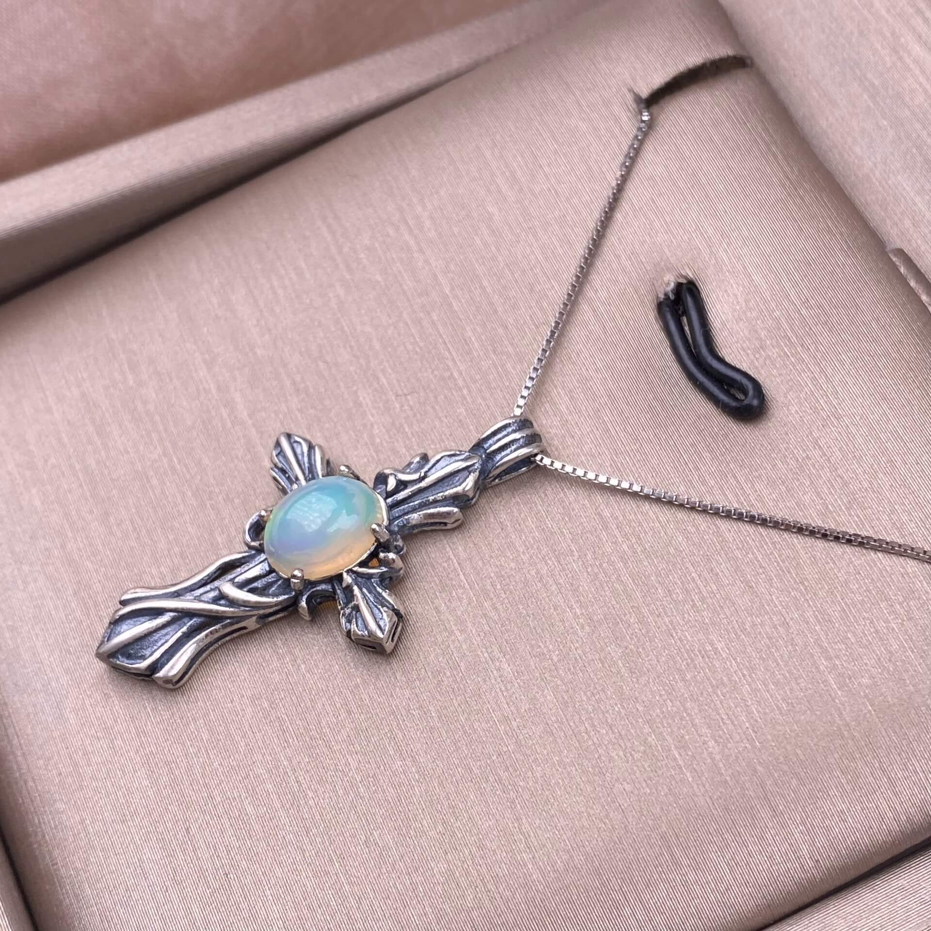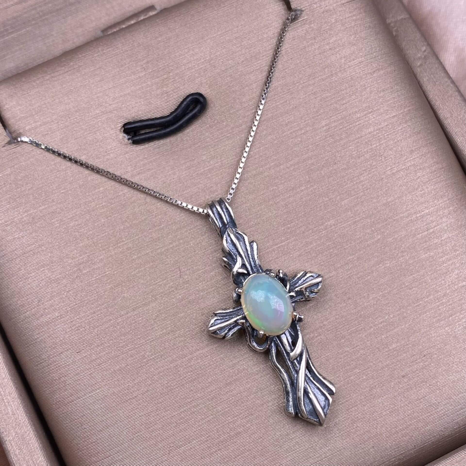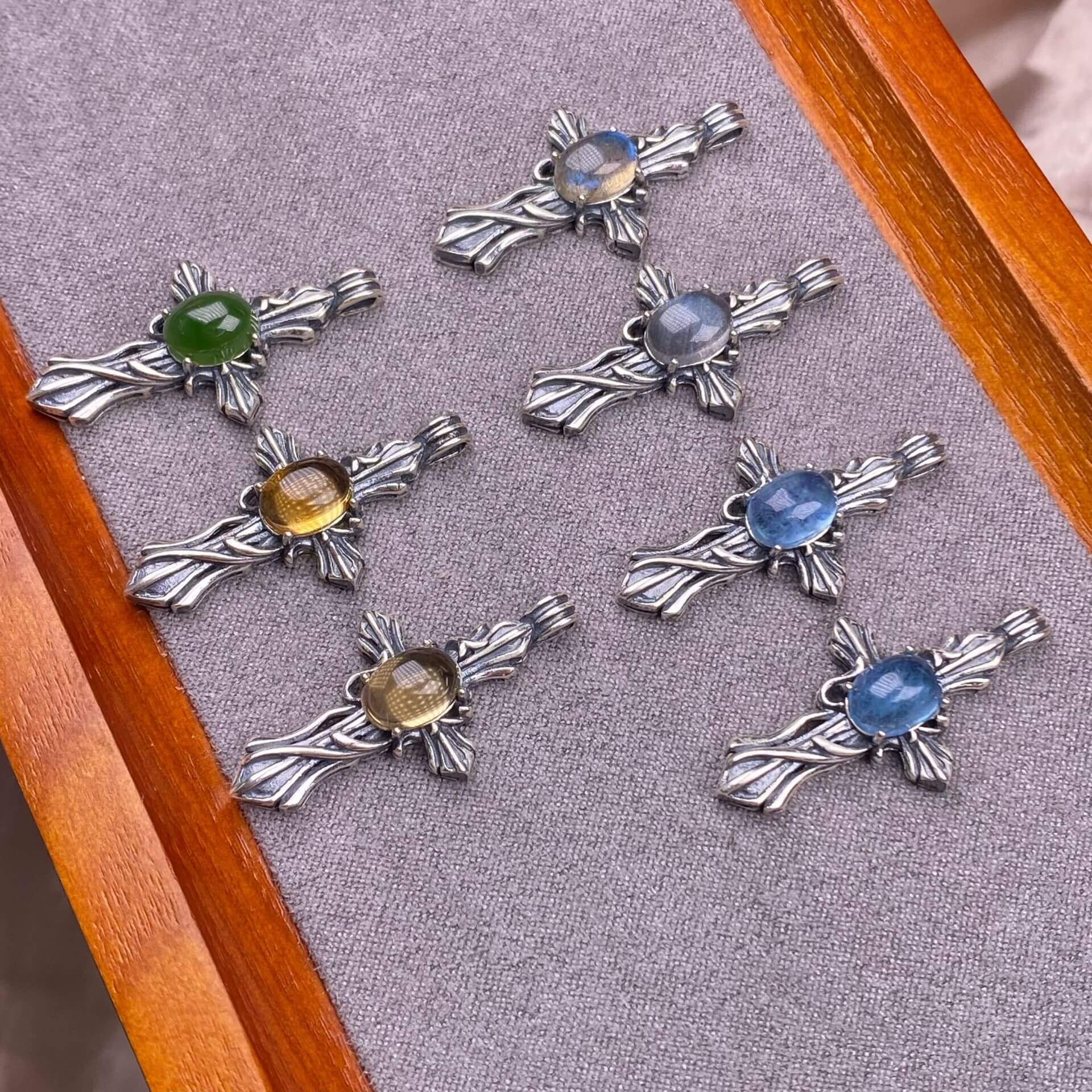 Opal, abalone shell, Larima sea crest stone, grey moonstone, aquamarine, jasper, citrine, turquoise, old waxS925 silver inlaid retro silver cross pendant, aged, personalized and fashionable OL necklace Pendant