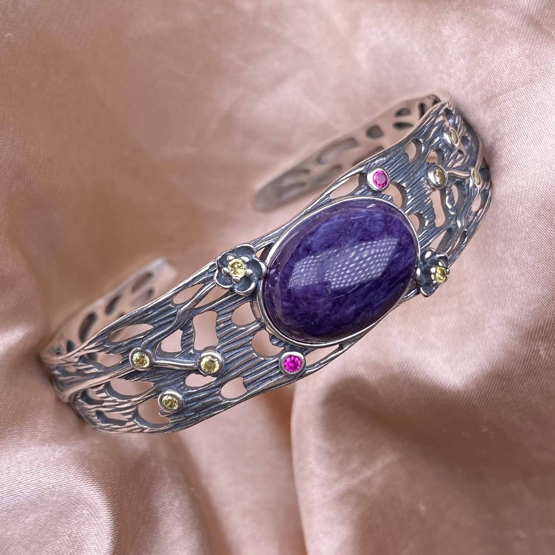 Purple lithium glow, purple dragon crystal The s925 silver bracelet is a wide, retro, and hollowed-out design for women's jewelry