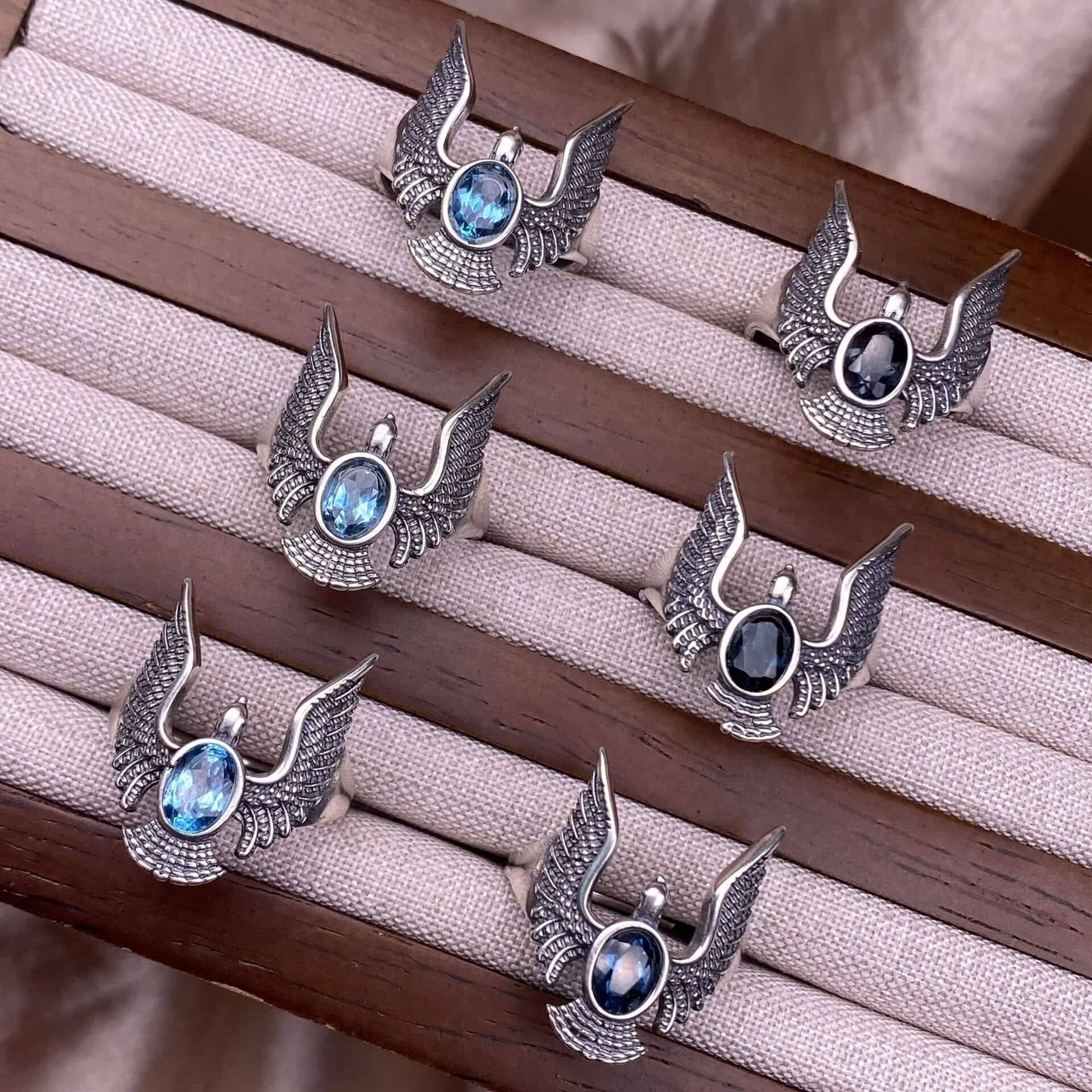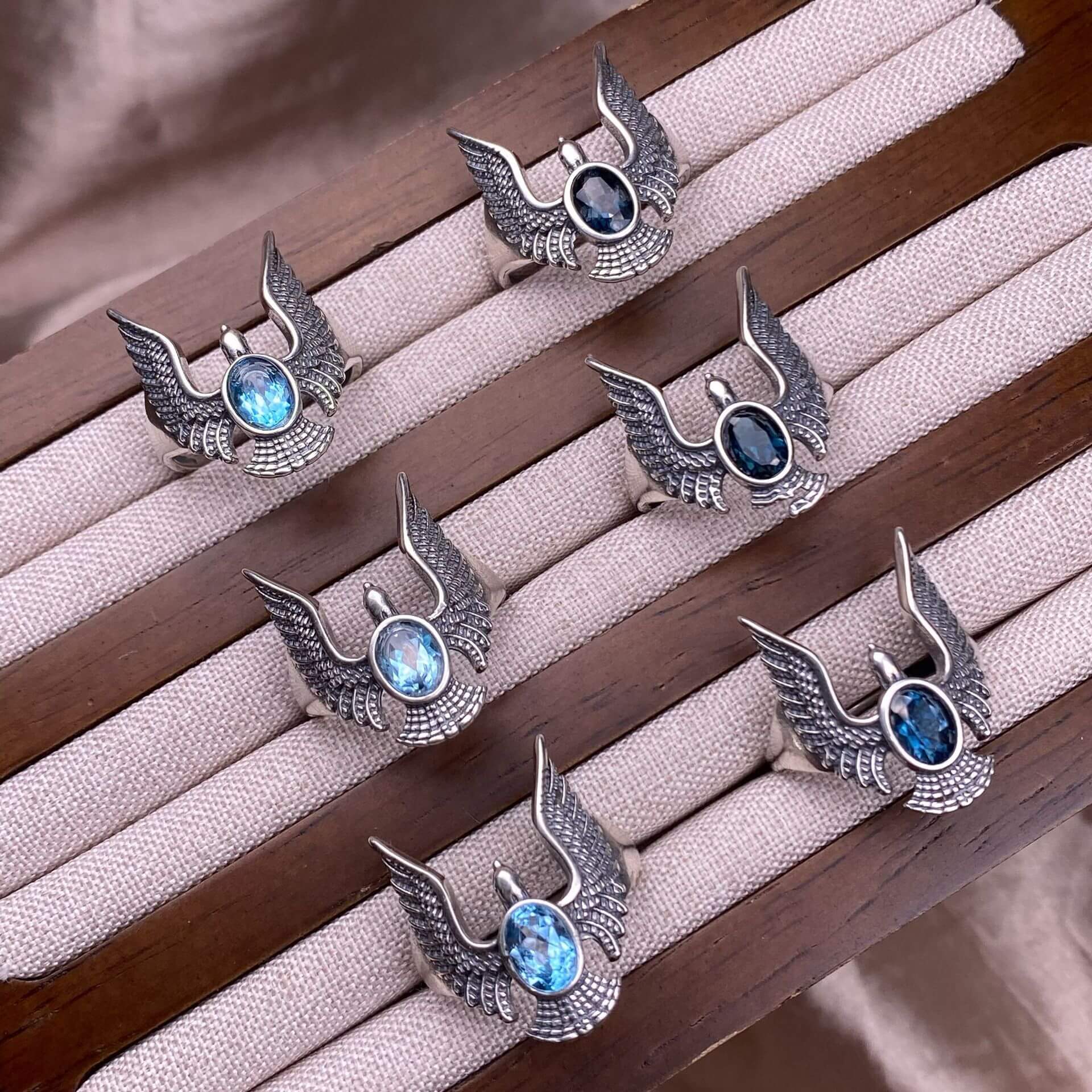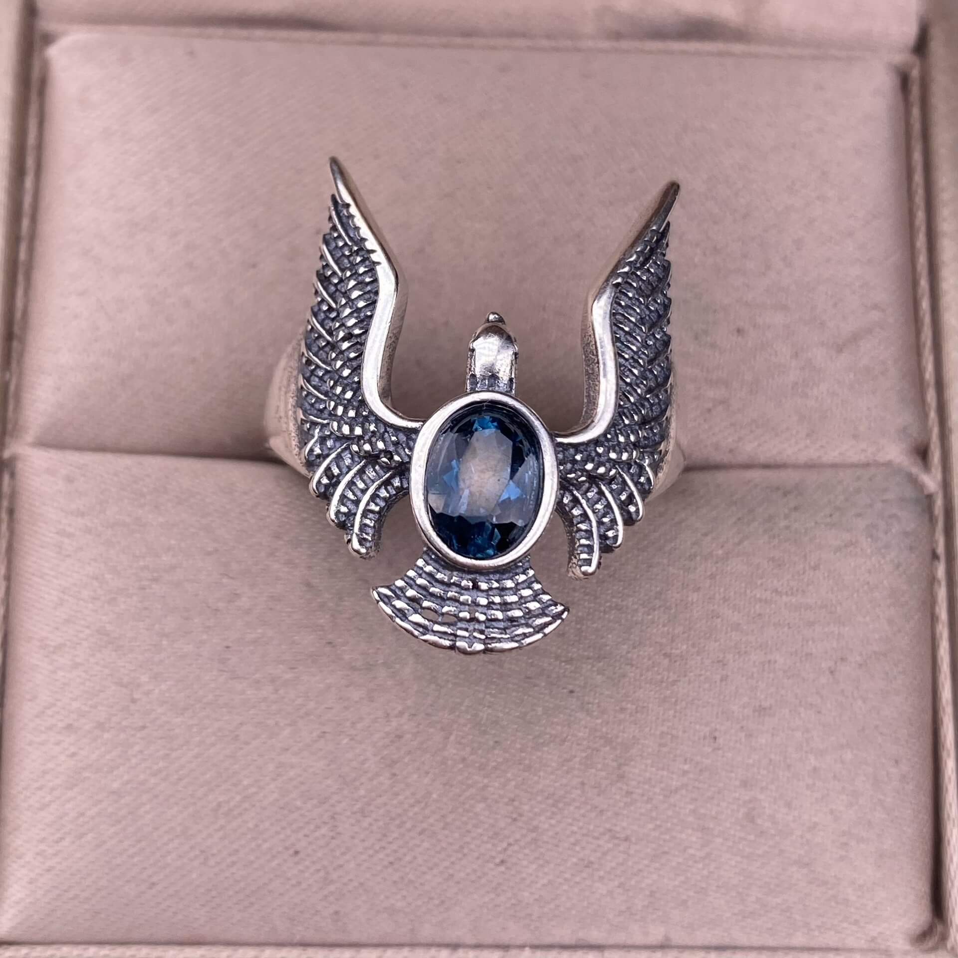 London blue topaz, Swiss blue topaz, grey moonstone, Golden Fortune stone ring S925 in silver eagle shaped silveer ring